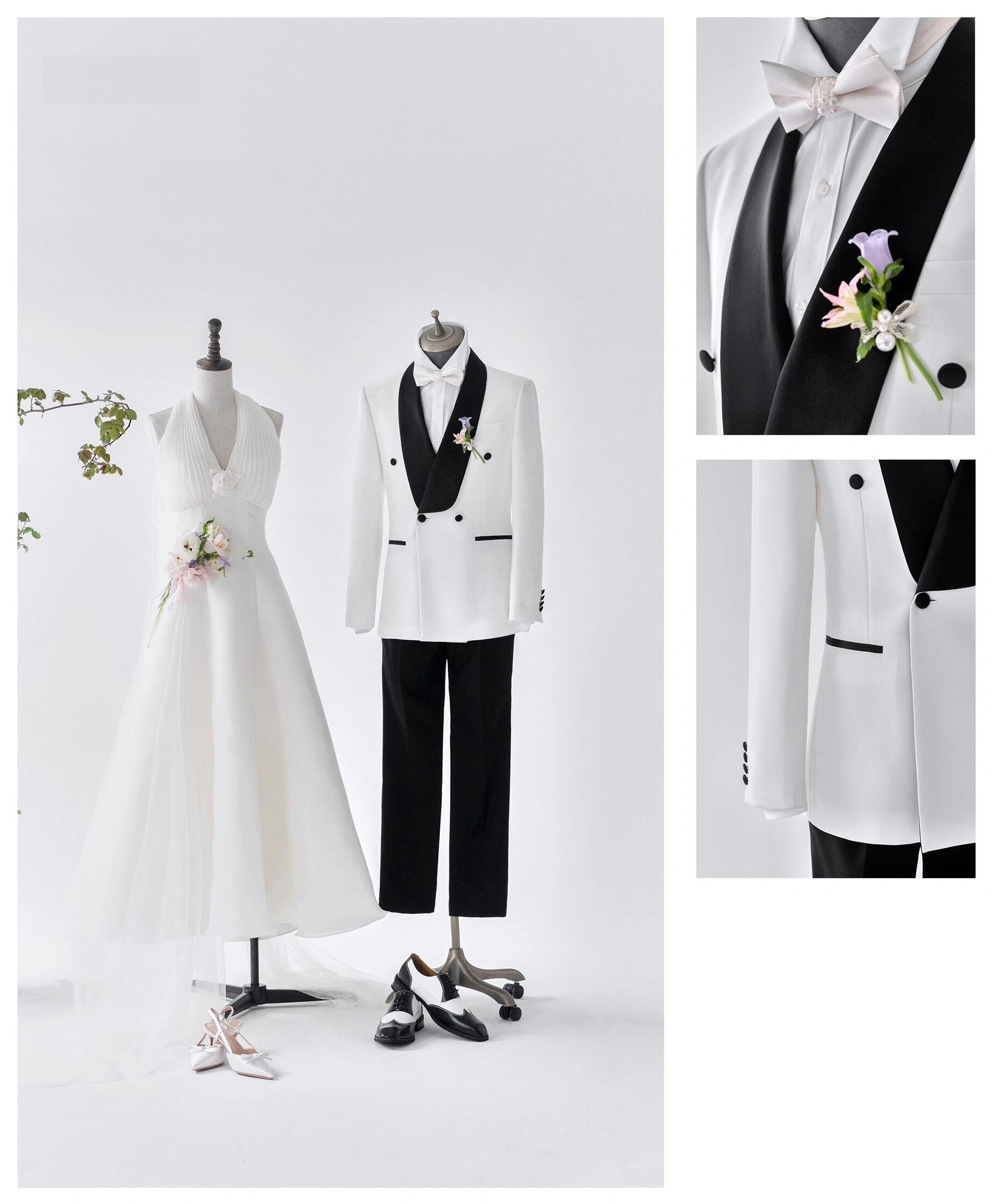 Style: Double-breasted peak lapel tuxedo with contrasting black lapel.